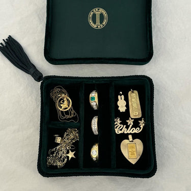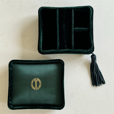 Designed to hold your most treasured pieces, this deep green velvet box features two small compartments, one long compartment, and a space to hold rings.