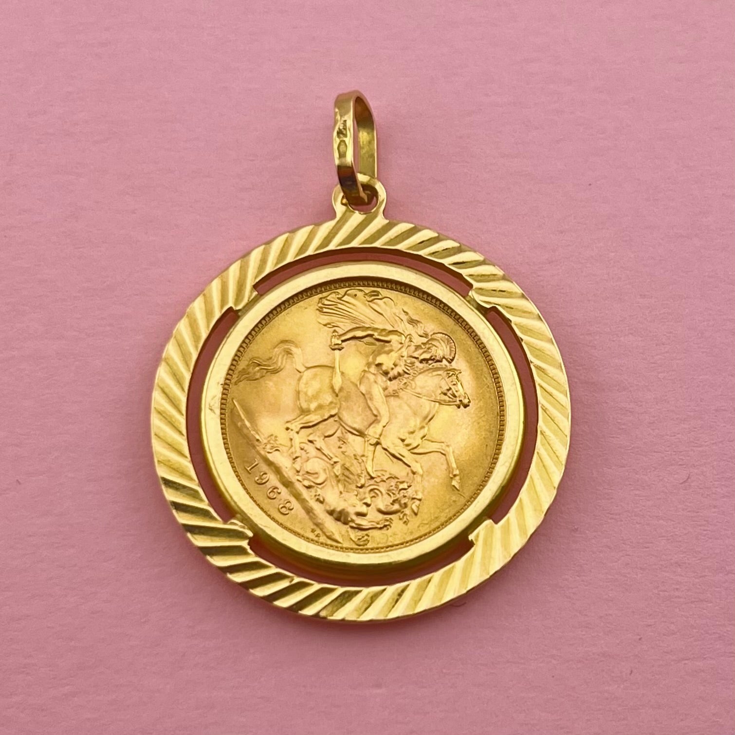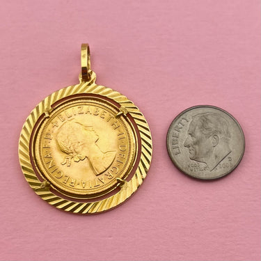 - Purity: 18k yellow gold frame, with a 22k yellow gold coin