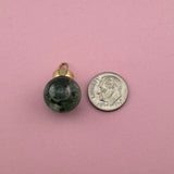 • Features several floating green stones. Since they are encased in the pendant, we cannot test them but believe them to be emeralds.